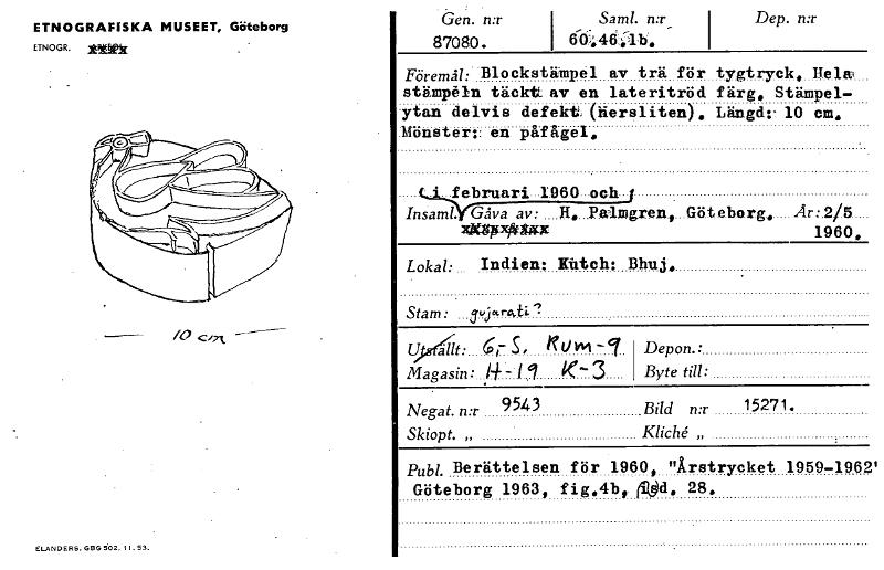 ETNOGRAFISKA MUSEET, Göteborg ETNOGR. ~ex /0 cin ELANDERS, GBG 502. 11. 53. Gen. tur 87080. Saml. mr I 6k 40.b. i .19ep.rur Föremål: Blockstämpel av trä för tygtryck. Hel& stämpeln täckt: av en lateritröd färg. Stämpel- ytan delvis defekt:(nersliten). Längd:• 10 cm. :Mönster:: en påfågel. Cl.. februari .1.960 och-/ himåNrIGUvaav:__R....Palmgrenl Göteborg. Ar:2/5 xxxgx,41txx 1960. Lokal: Indien: Khtch: Bhuj. Stam: rjetr4b- '? U äh: 6,--S, Mulm-ef Magasin: H--- 1,i K 3 Depon.: Byte till: Negat. n:r 9543 Bild fur 15271. Skiopt. ” Kliché „ Publ. Berättelsen för 1960, "Årstrycket 1959-1962 Göteborg 1963, fig.4b, 41,0, 28. [ocr]