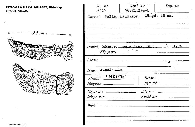 • ETNOGRAFISKA MUSEET, Göteborg ETNOGR. AU tikna 11~ sodtalw4) gi I awatot I" BLAND ERS. GBB. 1972. Gen. n:r 95049 • . . ... _.. Saml. Mr I 76.21.19a—b Dep. mr Föremill• halmskor, Längd: 28 cm. _Pulla, ... Visa hela