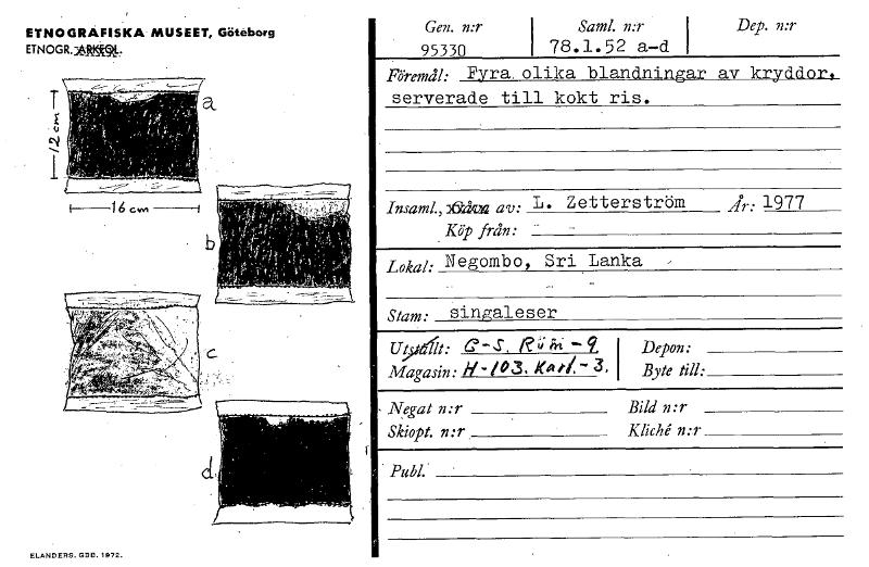 ETNOGRAFISKA MUSEET, Göteborg ETNOG ELANDERS. GER. 1072. Gen. n:r 95330 SamL n:r I 78.1.52 a—d Dep. 2i:r Föremål: yra. olika blandningar av kryddor, serverade till kokt ris. Insaml.,y5calvx av: • L. Zetterström i r • 1977 Köp från: - Lokal: Negombo, SriLanka Stam: singaleser Ut /t: C-S. R■5' hi: — 9 Depon: I Byte till: Magasin hl -1'03. 164 44,- 3, Negat n:r Bild n:r Kliché n:r Skiopt. n:r . Publ. [ocr]