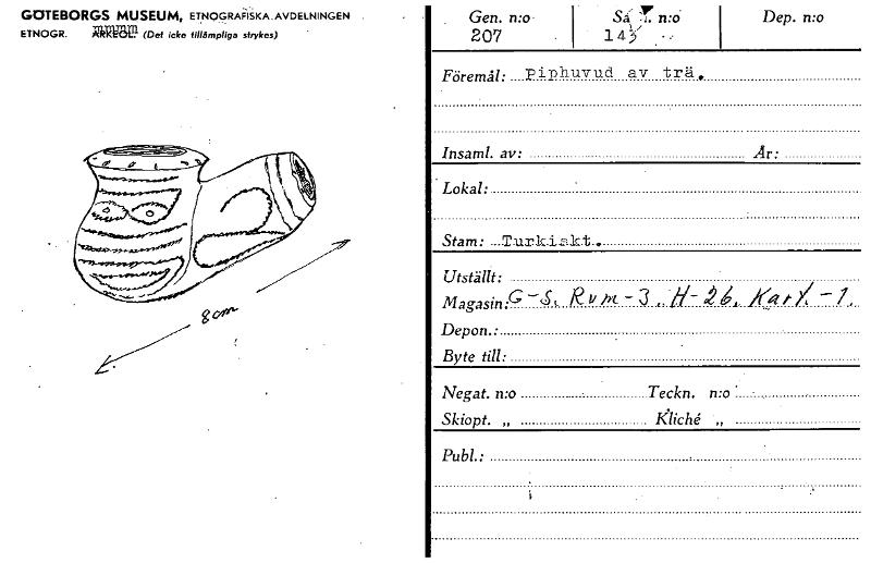 • GOTEBORGS MUSEUM, ETNOGRAFISKA. AVDELNINGEN ETNOGR. ÄrklaW• (Det icke tillämpliga strykas) Gen. n:o 207 Så '*n:o • 145 Dep. n:o Föremål: .Piphuvuel av trä, Insaml. av: År: Lokal: Stam: ...Tiarkl,skt... Visa hela