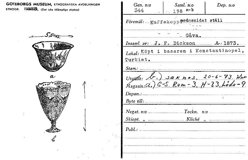 • GOTEBORGS MUSEUM, ETNOGRAFISKA AVDELNINGEN ETNOGR. Maga. (Det icke tillämpliga strykes) Gen. n:o 344 Sam1.- ivo 198 '121 Dep. n:o Föremål: raffek..0.19.1-Anedrnsnidat ställ - Ct - Gåva. Insaml. sy: J.... Visa hela