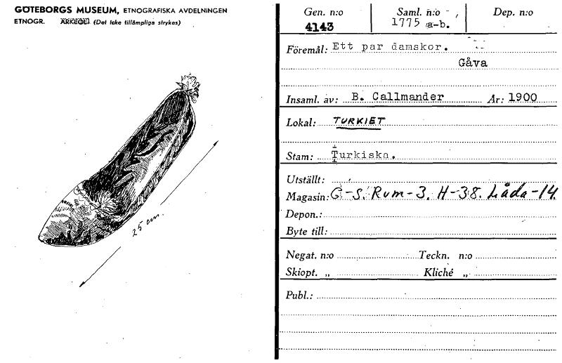 • Föremål: Ett par damskor. År: 1900 Insaml. av: B. Callmander GOTEBORGS MUSEUM, ETNOGRAFISKA AVDELNINGEN ETNOGR. Mikaitin (Det Icke tillämpliga strykas) Gen. n:o 4143 Saml. , 1775 ra-b. Dep. mo Gåva L... Visa hela
