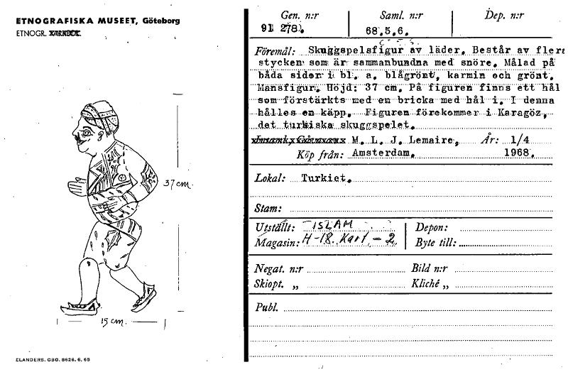 ETNOGRAFISKA MUSEET, Göteborg ETNOGR. ~or. 37c444_. I — . 1 ELANDERS. GDG. Gen. n:r 911 2781 Saml. n:r i 68•,5„6„ Dep. n:r 1 Föremål: Skuggspelsfigur av läder, Består av fle stycken, som ärr sammanbundna med snöre, Målad på båda sidor: i 1, a„ blägrönti, karmin och grönt, .Mansfigur„ Efbjd: 37 cm, På figuren finns ett hå som•förstärkts med en bricka med hål i, I denne hålles en käpp, Figuren förekommer i Karegöz, det turkiska- skuggspelet. xbusamic~a~x M..L. J. Lemaire9 jr: 1/ 4 Köp från: Amsterdam, 1968, Lokal: Turk i et. Stam: Utställt: — i SZA M I Depon: Magasin: -1,e• -1(491,— 4,• i Byte till: Negat. n:r Bild n:r Skiopt. „ Klich6 „ Publ. rF [ocr]