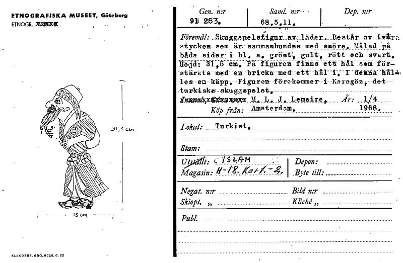 ETNOGRAFISKA MUSEET, Göteborg ETNOGR. 2W6D' 31, s c. 1 1 5 cm{ ELANDERS626.6.65 Gen. n:r 91 283. Saml. n:r-- • i 68,..5.11. I Dep. n:r .,-• • Föremål: Skugg.s.pe.l.o.figur...aw..läde.r......Be.står...av...tir&: stycken: som är- sammanbundna med snöre, Målad på • båda sidkor i bl. a, grön-4 gult, rött och svart, Höjd: ål.95 cm, På figuren finns ett hål som för. stärkts med ea brickw med ett hål i. 1 denna hå: len-em-käpp. Figuren TöTekommer-i-Karagär, det Aurkiskaskuggspelet. itymetsx004,3xxxx M. L. J, Lemaire, Ar: 1/4 Köp från: Amsterdam, 1968, Lokal: Turkiet, Stam: . Uissidt : C. 1,-54-172 Magasin: H-" • /, x ,.4- , Depon: - 1 ,Byte till: - Negat. n:r Bild n:r Skiopt. „ Kliché,, Publ. • . Et [ocr]