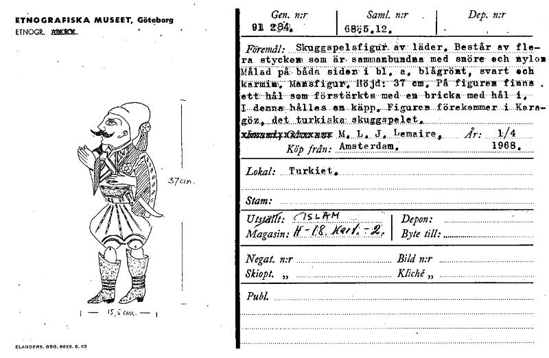 • ETNOGRAFISKA MUSEET, Göteborg ETNOGR. ELANDERS.GMB626.6.65 Gen. n:r 91 e84; Saml n:r , i 685.12. I Dep. n:r I - ' • Föremål: Skuggspelsfignk av läder. Består ev Lie ra styckero som är sammanbundna me... Visa hela