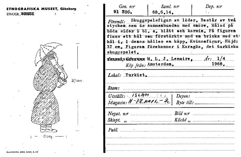 37owt — 15 cubi , ELANDERS. GBG. 8626. 6. 65 Gen. n:r 91 286. Saml. n:r i 68.'5.14. • Dep. n:r I Föremål: Skuggspelsiigut av. läder. Består av tvi stycken-. sem. är: sanraanbuadaa• med snöre-. Målad på• bilda siden- 1 *bl, a. blått och karmin. Pii-figurei .firas...ett-hål----smif-törstärkts-med-en-bricku-vred••1 hål i. I .denna-hålle.s..-ell-käppwiKVillilld . i . gar;....Ffäj ..3.7....em....F.iguren...förek.ommer. 1 Ka.rag.ä.z.,...d.e.t ... turkisi skuggspelet, åtrarkikcettpwrack M, L, J J. Le mai re 9 År: 1/4 Köp från: Amsterdam. 1.968, . Lokal: Turkiet, . Stam: Utställt: • I S i- *41 - . • Depon: Magasin: 4 & .10. ,— I Byte till: Negat. n:r Bild n:r Skiopt. „ Kliché» >3 • Publ. • ETNOGRAFISKA MUSEET, Göteborg ETNOGR. youm [ocr]