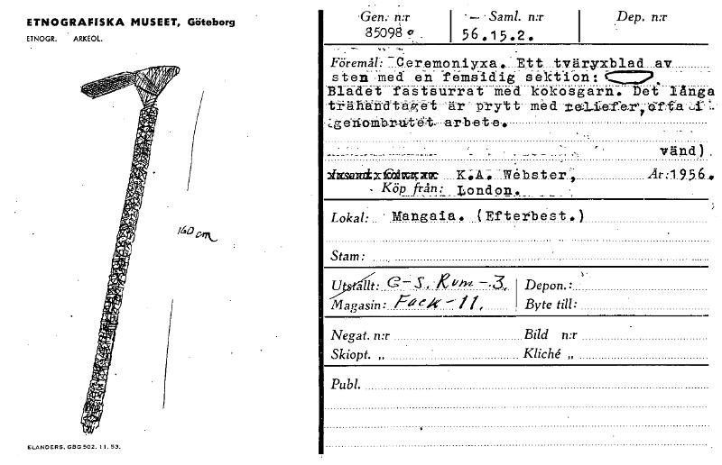 ETNOGRAFISKA MUSEET, Göteborg ETNOGR. ARKEOL. G8 e5n0. nå: I Saml. n:r Dep. n:r 56.15.2. Föremål: -Ceremoniyxa. Ett tväryxblad av sten .med en -femaidig sektfon: Bladet fastaurrat med kokosgarn. Det l...Visa hela