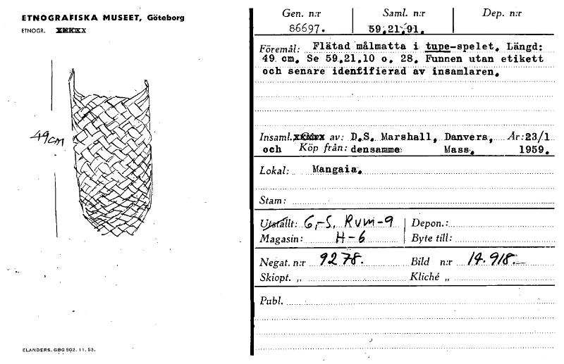 ETNOGRAFISKA MUSEET, Göteborg ETNOG R. XXXX.X Gen. n:r I Sam!. n:r Dep. n:r 86697. I .59;21;191 Föremål: Flätad målmatta i tupe—spelet. Längd: 49. cm. Se 59.21.10 o. 28. Funnen utan etikett och senare identifierad av insamlaren. Insaml. av: ..D..S....blarshall ..Danve.rat Ar :2311.. ,. och Köp från: densamme Masa 1959. Lokal: Mangaia:. Stam: U allt:. Ii vi -9 Magasin: 6 Depon.: Byte till: Bild n:r Kliché „ Negat. n:r 7. Skiopt. „ Publ. ELANDERS. G139 502. II. 53. [ocr]Stäng
