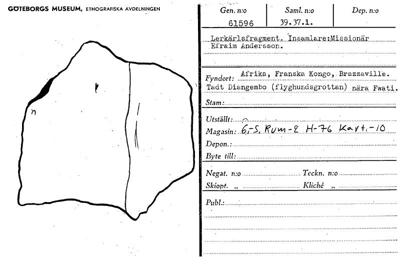 • GOTEBORGS MUSEUM, ETNOGRAFISKA AVDELNINGEN Sam!. n:o 39. 37.1. Dep. n:o Lerkärlsfragment. Insamlarelasionä Efraim Andersson. Afrika, Franska Kongo, .Brazzaville. Fyndort: Tadt Diangembo (flyghundsgrot... Visa hela