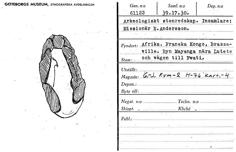 GOTEBORGS MUSEUM, ETNOGRAFISKA AVDELNINGEN Gen. n:o .61123 Saml. n:o 39.17.30.. Dep. n:o Arkeologiåkt st-enredskap. Yrsamlare! Missionär E.Andersson. Fyndort: Afrika, Franska Kongo, Brazza- ville. Byn...