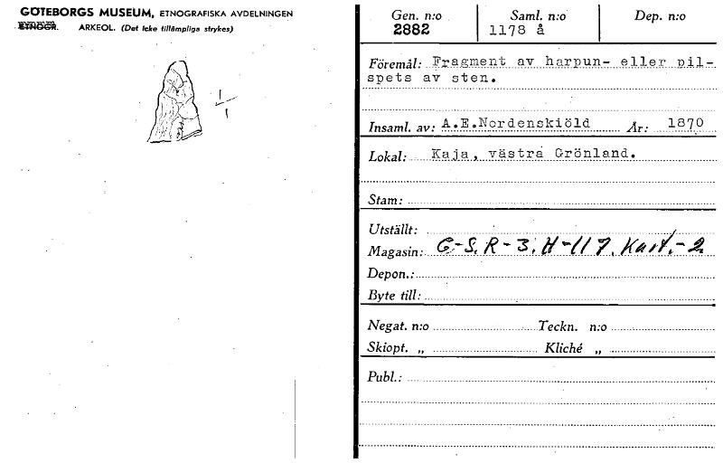 • GOTEBORGS MUSEUM, ETNOGRAFISKA AVDELNINGEN ARKEOL. (Det lake tillämpliga strykas) Gen. n:o . 2882 Saml. n:o 1178 å Dep. n:o Föremål: Fra gme-nt av harpun- eller pil- spets av sten. A.E.Nordenskiöld ... Visa hela