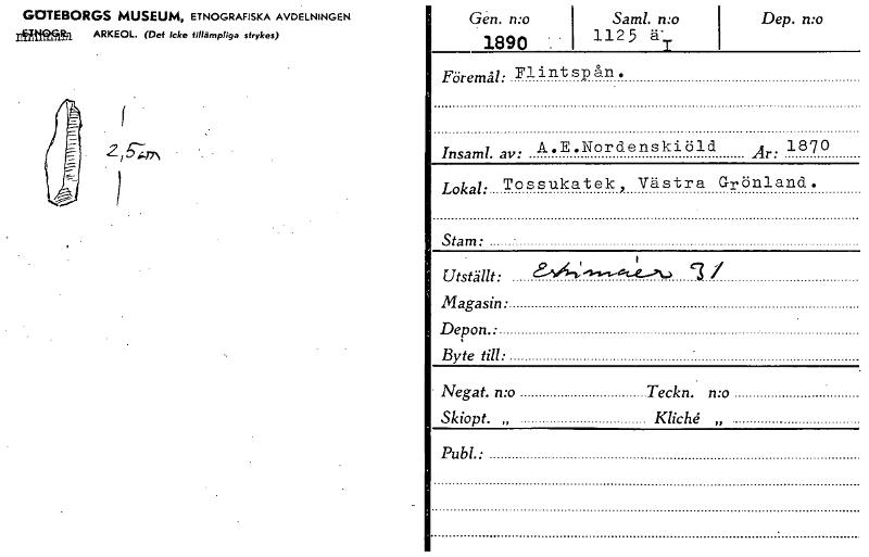 • GOTEBORGS MUSEUM, ETNOGRAFISKA AVDELNINGEN neffitrtk ARKEOL. (Def icke tillämpliga sfrykes) Gå. n:o 1890 Saml. n:o 1125 ä'T Dep. n:o 21 5747\ Föremål: Flint sp . Insaml. av: A.E.Nordenskiöld Ar: 187... Visa hela