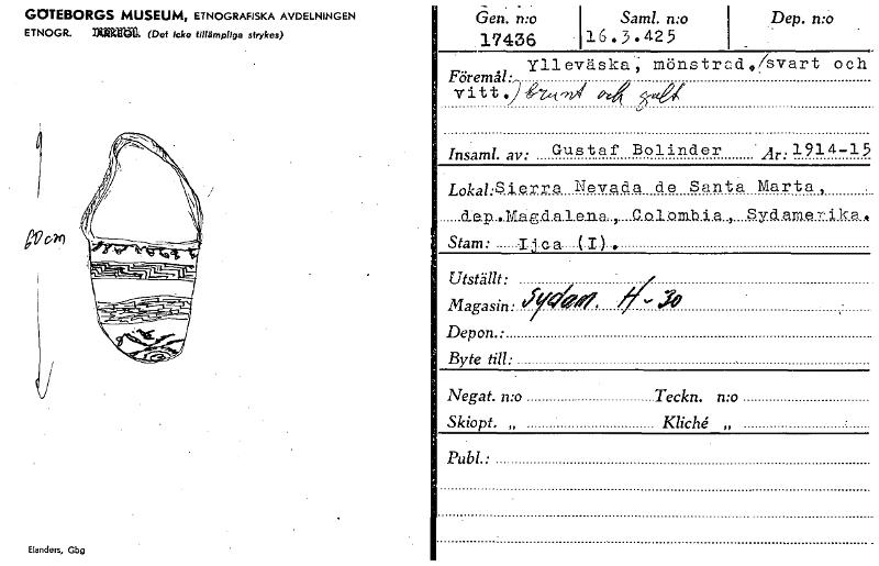 GOTEBORGS MUSEUM, ETNOGRAFISKA AVDELNINGEN ETNOGR. ~a. (Det icke tillämpliga strykas) Elanders, Gbg åeri. n :o" 17436 . Saml. n:o 16.3.425 Dep. n:o . _ Ylleväska',. mönstrad,,/svart och Föremål: vitt i -7.,..t ,5' Insaml. av: Gustaf Bolinder -Ar.1914-15 Lokal:Sierra -Nevada de Santa. Marta, , d:e.p....M.a.g.d.a.l.e.na , .G.o.l.om,b.i.a.., Syd.am.erika . Stam: -I jea (I). Utstänt: • Magasin: el)/44?: : Depon.: Byte till: . Negat. n:o Teckn. n:o Skiopt. „ KlicU „ Publ.: [ocr]
