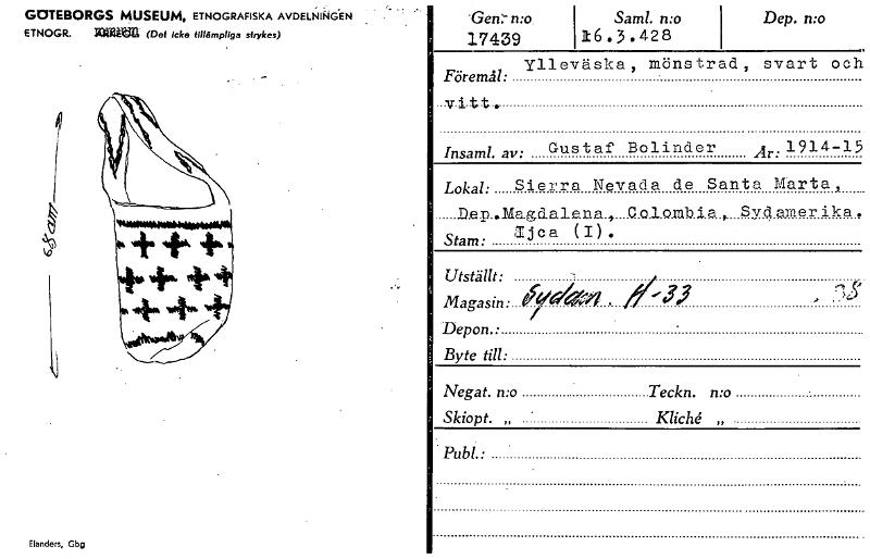 GOTEBORGS MUSEUM, ETNOGRAFISKA AVDELNINGEN ETNOGR. (Del icke tillämpliga strykas) Elanders, Gbg .Gen:-n:o Saml. n:o 17439 116.3.428 i Dep. n:o Ylleväska , mönstrad , svart och Föremål: .v-i-tt.. Insaml. av: Gustaf Bolinder Ar:1914-15 Lokal: Sierra Nevada de Santa Karta, D.ep..Mag.Eialena.t. C olomb.i.a.. Svc1 amer i ka . Ijca (I). Stam: . Utställt: -.. .. ..), Magasin: Ya/Oa4 . ."-‘1, r-, .5" / Depon.: Byte till: Negat. n:o Teckn. n:o . Skiopt. „ - KlicU „ Publ.• [ocr]