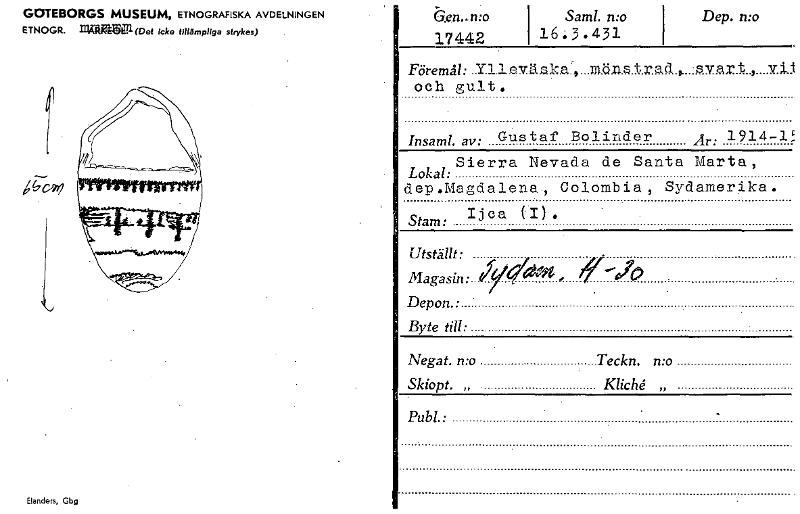 GOTEBORGS MUSEUM, ETNOGRAFISKA AVDELNINGEN ETNOGR. Inank$L111(Det icke tillåmpliga strykes) j&,?7 Elanders, Gbg bgn..n:o 17442 i Saml. n:o 16:3.431 Dep. n:o Föremål: .Y.11evilaka. ..M.ön..trad „. -svart , Vii och gult . Insaml. av: Gustaf Bolinder Ar: 1914-1f Sierra Nevada de Santa Marta, Lokal: dep.Magdalena, Colombia, Sydamerika. Ijca (I). Stam: Utställt: Magasin: y, , ,r.....„7„, - Depon.: Byte till: Negat. n:o Teckn. n:o Skiopt. „ Kliche. ,, Publ. • . [ocr]