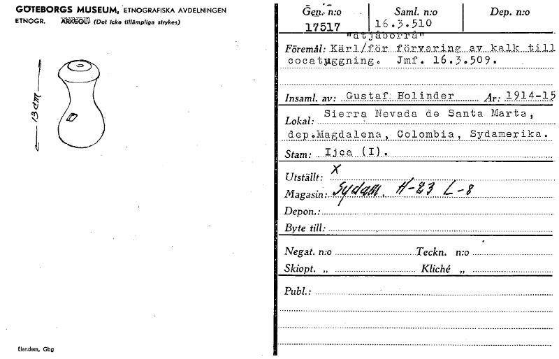 GOTEBORGS MUSEUM, ETNOGRAFISKA AVDELNINGEN E TNOGR. »igkill (Det icke tillämpliga strykas) Elandars, Gbg _ — Gen, mo 17517 Saml. n:o 16.5.510 Dep. n:o natjåoorrå- Föremg:Kär1ifär. fär..17=ingr av kalk tji./ cocatiggning. Jmf. 16.5.509. Insaml. av: Gustaf:Holinder År: 1914-15 Sierra Nevada de Santa Marta, Lokal: dep.Magdalena, Colombia, Sydamerika. Stam: Ijca (I). Utställt: x Magasin: IMig, . ....: y / Depon.: Byte till: Negat. n:o Teckn. n:o Skiopt. „ Kliché „ Publ.: [ocr]