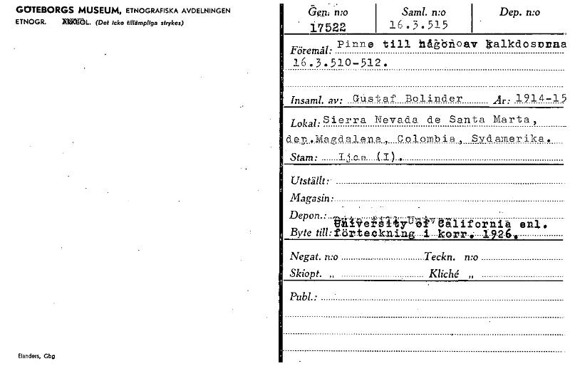 GOTEBORGS MUSEUM, ETNOGRAFISKA AVDELNINGEN ETNOGR. alitöL. (Det Icke tillämpliga strykas) Elanders, Gbg Gen. n:o ' 17522 Saml. mo 16.3.515 Dep. n:o Föremål:Pinne till hiWoripav kalkdosurna 16.3.510-512. Insaml. av: Gustaf Bolinder År: 1914-15 Lokal: Sierra Nevada de Santa Marta, den ,Magdalena Colombia, Sydamerika. Stam: lij.c (1.)... Utställt: Magasin. taii9eålly0WöälifotilliA enl. Byte till: törteckning—i—körri-19-26.8 Negat. n:o Teckn. n:o Skiopt. „ Michel „ Publ.: [ocr]Stäng