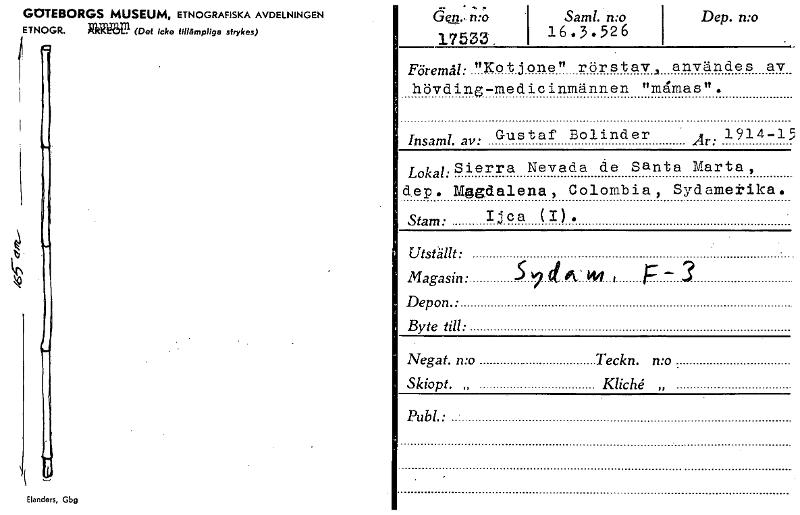 GOTEBORGS MUSEUM, ETNOGRAFISKA AVDELNINGEN ETNOGR. Ritaä. (Det Icke tillämpliga strykas) Elanders, Gbg — - .., Gen.,no 17533. Saml. n:o 1 16.3.526 Dep. n:o Föremål: "Kotjone" rörstav, användes av hövding-medicinmännen "måmas". Insaml. av: Gustaf Bolinder Ar: 1914-15 Lokal: Sierra Nevada de Santa Marta , dep. Mggdalena , Colombia, Sydametika. Stam: Ijca (I). Utställt: Magasin: .A...1.44..., .................. Depon.: Byte till: Negat. n:o Teckn. n:o . Skiopt. „ Kliché „ Publ.• [ocr]