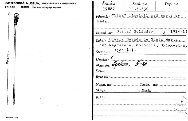 GOTEBORGS MUSEUM, ETNOGRAFISKA AVDELNINGEN ETNOGR. nera. (Det icke tillämpliga strykas) Elanders, Gbg _ — Gen.-n:o 17537 Saml. n:o 16.3.530 Dep. n:o Föremål: "Tina" fågelpil med spets av kåda, Insaml. av: Gustaf Bolinder År: 1914-15 Lokal:, Sierra Nevada de Santa Marta, dep.Magdalena, Colombia, Sydamerika. Ijca (1 ) . Stam: Utställt: Magasin: ell/d0/1- _14 Depon.: Byte till: Negat. mo Teckn. mo Skiopt. „. Kliché .„ Publ.• [ocr]
