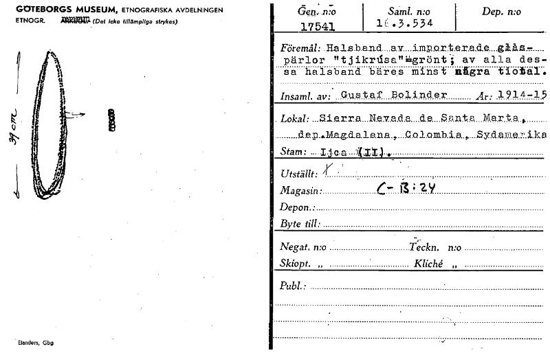 GOTEBORGS MUSEUM, ETNOGRAFISKA AVDELNINGEN ETNOGR. JZIE~ (Det !eke tillåmpliga strykes) Elanders, Gbg ..n:o Gen, .n:o Gen Saml. n:o 1(.3.534 Dep. n:o Föremål: , Ha..1.s.b.and....av....imp.or..t.e.r.a.cle.....glå.a - pärlor ntjikrtisa"i=grönt-t av alla des- sa halsband bäres mins t nägra tiotal. Insaml. av: Gustaf Boll nd er Är: 1914-15 . Lokal: ...Sierra...N.ev.a.d.a....d.e. ... SAnt a Marta , de p...M__a.g.d.ale.na.,...Uramb.i.a.,...By.d.ane.r.i.ka Stam: .... 1j-o.a.-Alt) a Utställt: Magasin: " a ; ZY Depon.: Byte till: Negat. n:o Teckn. mo Skiopt. „ Kliché „ Publ.: [ocr]