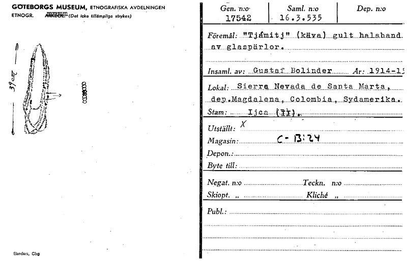 GOTEBORGS MUSEUM, ETNOGRAFISKA AVDELNINGEN ETNOGR. aläggl(Det icke tillämpliga sfrykes) Elandars, Cbg Gen, 'n:o- - 17542 Saml. n:o • 16.3.535 Dep. n:o Föremål: "Tttini.t.j " (kily.a.)....gult...hale.b.and. ....av_gla.spärlon. Insaml. av: Guztar. Jkainder Är: .1.9.14-3,.; Lokal: Sierra Nevada de Santa Märta, ...gl.elMgd.alen.a.,_.C.caombiayd.amerika... Stam: ii ca eii).. Utställt: 'Y Magasin: C' a: 1.4 Depon.: Byte till: Negat. n:o Teckn. n:o Skiopt. „ Kliché,, Publ. • [ocr]