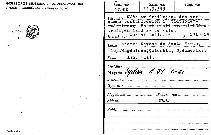 • GOTEBORGS MUSEUM, ETNOGRAFISKA AVDELNINGEN ETNOGR. we= (Det Icke tillämpliga strykas) Elanders, Gbg Gem n:o 17562 Saml. n:o • 16.3.575 Dep. n:o Föremål: Kåda av frailejon. den verk- samma beståndsdel... Visa hela