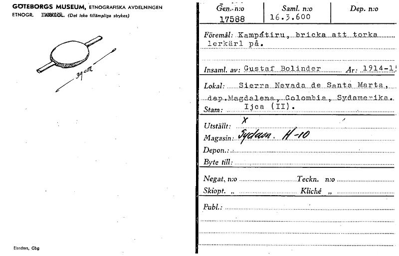 GOTEBORGS MUSEUM, ETNOGRAFISKA AVDELNINGEN ETNOGR. Maffia . (Det (eke tillämpliga strykas) Elanders, Cbg den... _ .. ...n:o 17588 Sam!. n:o 16.3.600 Dep. n:o Föremål: ..Kampg.ti.r.u.,....b.ria.ka....att .... to.r.ka lerkärl på. Insaml. av: Gustaf Bol inder Ar: 1914-1 Lokal: Sierra .Nev.a.d.a d e Santa Marta, d_ap...D.lag_d-alana.,....Gol.cambi.a..,....Sy.damo.-2.i.k.a.. Stam: Ijca (II). . • , Utställt: X Magasin: 1//''1'* 1 . Depon.: . • Byte till: . Negat, n:o Teckn. mo Skiopt. „ Kliché „ Publ.: [ocr]