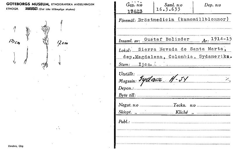 • GOTEBORGS MUSEUM, ETNOGRAFISKA AVDELNINGEN ETNOGR. ~am (Det icke tillämpliga strykes) m Elanders, Gbg Gen" : n:o.' 1762.3 Saml. n:o 16.3.633 Dep. n:o Föremg:.Bröstmedicin (kamomillblommor) Insaml. av:... Visa hela