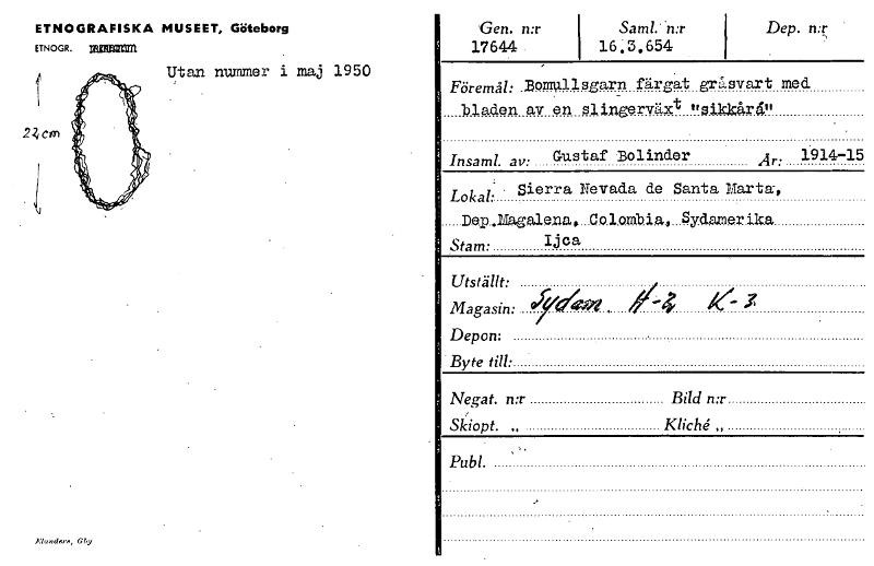 ETNOGRAFISKA MUSEET, Göteborg ETNOGR. reliffinarti -Gen. n:r Saml..'n:r 17644 16;3,654 Dep. n:r Föremål: Bormalsgarn färgat grzIsvart med. bladen av en slingerväxt treik,kår6.1, Insaml. av: Gustaf Bolinder Ar: 1914-15 Lokal: Sierra Nevada de Santa Marta, Dep..Magalena,. Colombia, Sydamer ika Stam: Ijca 22, c,r Utan nummer i maj 1950 Utställt: Magasin: Depon: Byte till: Bild n:r Negat. n:r „ Sk(iopt. ., Kliché Publ. Ehrnders, G by [ocr]