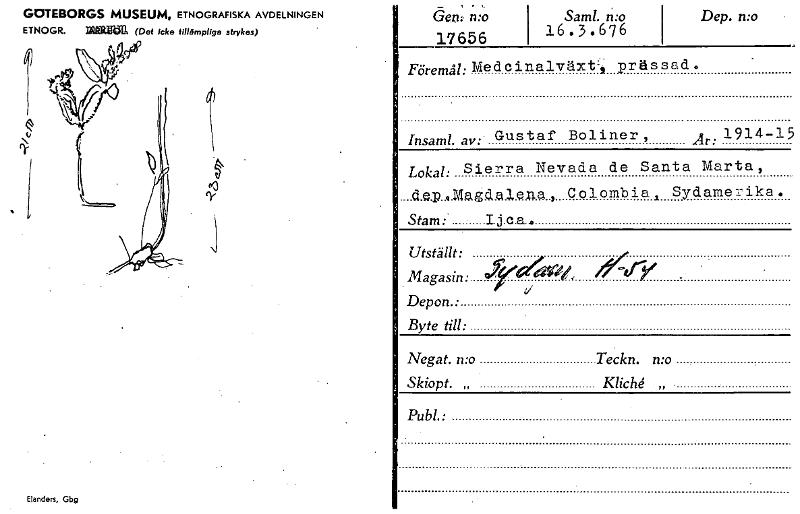 GÖTEBORGS MUSEUM, ETNOGRAFISKA AVDELNINGEN ETNOGR. 119}~ (Det icke tillämpliga strykas) Elanders, Gbg Gen: n:o 17656 , 16.ST.L6n7:6 Dep. n:o Föremål: NiedcinalväxV2. ..präs sa. d . Insaml. av: Gustaf Boliner , År: 1914-15 Lokal: Sierra Nevada de Santa Marta, ._..d.e.p...Megdalen.a , Colombia, Sydamerika . Stam:. Ii.c.a... Utställt: Magasin: jr drii; Y z/ Depon.: Byte till: Negat. n:o Tec kn. n:o Skiopt. „ Kliché „ • Publ.: • [ocr]