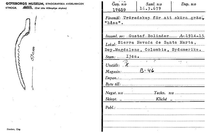GOTEBORGS MUSEUM, ETNOGRAFISKA AVDELNINGEN ETNOGR. ag/5.. (Det icke tillämpliga strykas) Elanders, Gbg — . - — Gen: n:o 17659 Saml. n:o 16.3.679 Dep. n:o Föremål: ..Trär.e.d.skan...f.ö.r...a..t.t..._skära gr.ä.,s4. "håsa" . Insaml. av: ...G:u.s.t.af....Bolind.er Är:19.14=1.5. Lokal: Sierra Nevada de Santa Marta, De.p.Magdalena, Colombia, Sydamerika. Stam: Ijca. , Utställt: X Magasin: il' 4 4 Depon.: Byte till: Negat. n:o Teckn. n:o Skiopt. „ Kliché „ Publ. • [ocr]