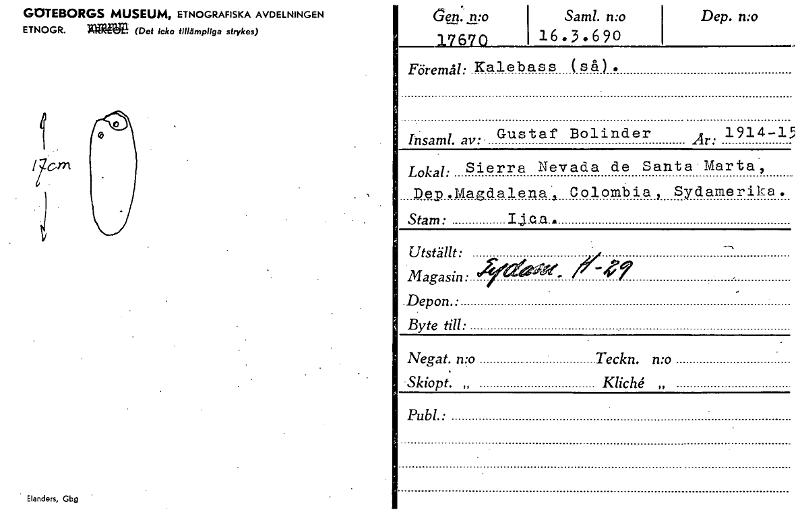 • GOTEBORGS MUSEUM, ETNOGRAFISKA AVDELNINGEN ETNOGR. »Ziff (Det Icke tillämpliga strykes) Elanders, Gbg Gen: n:o 17670 Saml. n:o 16.3.690 Dep. n:o Föremål: Kalebass ( så) . Gustaf Bolinder 1914-15 In sa... Visa hela