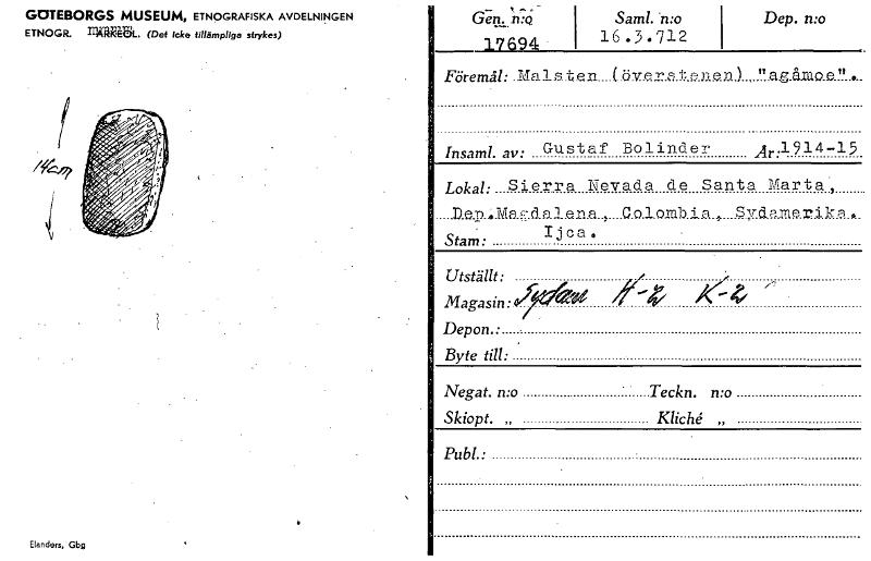 GOTEBORGS MUSEUM, ETNOGRAFISKA AVDELNINGEN ETNOGR. 1114krErlk. (Det Icke tillämpliga strykas) Elanders, Gbg Gen. :Jo' 1'7694 - Sam!. 'mo 16.3.712 Dep. n:o Föremål: .Idalsten....(bv.e 72 .,9 t e no.D..) ,, " agAro.o.e " • Insaml. av: Gustaf Bolinder Ar:1914-15 Lokal: Sierra Nevada de Santa Marta, Dejx...Ma.,-:.(lalerla,..G.caomi,a„. Syclutulrika... I j ca. ,tam: Utställt: --, • Magasin: Depon.: Byte till: Negat. mo — Teckn. mo Skiopt. „ Kliché „ Publ.. [ocr]