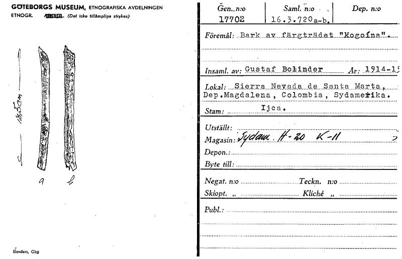 c GOTEBORGS MUSEUM, ETNOGRAFISKA AVDELNINGEN ETNOGR. AZEBIa. (Det icke tillämpliga strykas) q Efanders, Gbg ö en...n:-o 17702 Saml. mo - , 16.3.720a—b. Dep. n:o Föremål: _Bark _av fä.r.a.- t.r.ä..t "Ko.g.o.lna!!........ Insaml. av: Gustaf Bolinder Är; 1914-1 Lokal: Sierra Nevada de Santa Marta Dep .Magdalena , Colomb ia , Sydamerika. I Stam: j c a . Utställt: Magasin: Pfr °( • f Ib'' — // Depon.: Byte till: . 7 Negat. n:o Teckn. n:o Skiopt. „ Kliché „ Publ. • [ocr]Stäng