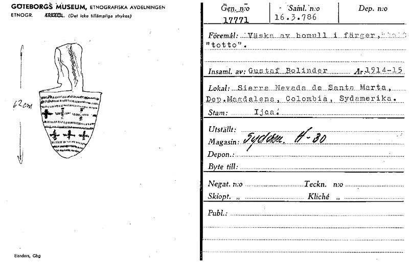 GOTEBORGS MUSEUM, ETNOGRAFISKA AVDELNINGEN ETNOGR. . (Del icke tillämpliga strykas) Elanders, Gbg Ö en, n.:-o .17771 - 'Sainl.'n:o 16.3.786 Dep. mo Föremål: "totto". Insaml. av: aus a.f 13o 1 inder År...