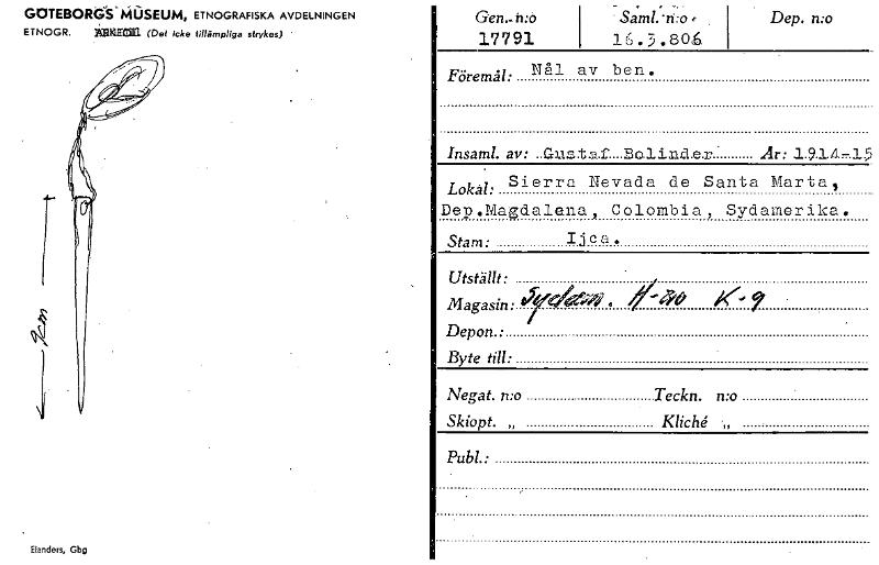 GOTEBORGS- MCISEUM, ETNOGRAFISKA AVDELNINGEN ETNOGR. åkrarna (Del icke tillämpliga sfrykes) Elanders, Gbg Gen.-ivö 17791 . Saml.•ri:o , 16.3.80,6, Dep. n:o Föremål: Nål av ben. Insaml. av: ..Glist::,.f Balindex Ar: Lokal: Sierra Nevada de Santa Marta, Dep.Magdalena , Colombia, Sydamerika. Stam: I j c .-1 e Utställt: Magasin: g,10/040 . i-449 Ar.° ? Depon. • Byte till: Negat. n:o Teckn. n:o Skiopt. „ Kliché .,, Pub!.: [ocr]