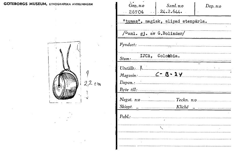 GOTEBORGS MUSEUM, ETNOGRAFISKA AVDELNINGEN -. - Gen, 12:0 - - 26704 Saml. n:o 24.2.644. Dep. n:o "tumas", magisk, slipad stenpärla. faml. gj. av G.Bolinder/ Fyndort: Stam IJCA, Colombia. • Negat. n:o Teckn. n:o •Skiopt. „ Kliché „ Utställt: 1\ Magasin: Depon.: Byte till: Publ.: [ocr]