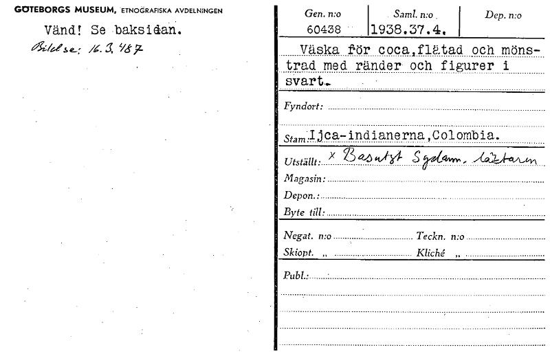 • Gen. n:o . Sarnl. n:o . Dep. n:o 60438 1938.37.4. Väska för coca,flätad och möns- GOTEBORGS MUSEUM, ETNOGRAFISKA AVDELNINGEN Vänd! Se baksidan. £/d: 9d7» trad med ränder och figurer i svart. Fyndort:... Visa hela