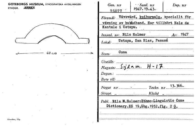 GÖTEBORGS MUSEUM, ETNOGRAFISKA AVDELNINGEN ETNOGR. "PC 60 c/77 Memiers,G19 Gen. n:r 768" - "Santl. n:r 1947.19.43._ Dep. n:r Föremål: Vävåvärdj, koiburwala, speciellt för vävning av hulkildband. Har tillhört Nele de Kantule i Ustupu-. - Insaml. av. Nils Holmer Ar• 1947 Lokal: Irstupu, San Blas, Panama Stam: Cuna Utställt: Magasin: d.1i ok . 1 Depon.: Byte till: • Negat n:r Teckn. n:r 13' 366.. Skiopt. „ Kliché „ Pub1....111.1.a..M.HolmeriEthno-Linguistic Cuna Dictionary.ES 19,Gbg.1952,fig. 2 G. [ocr]