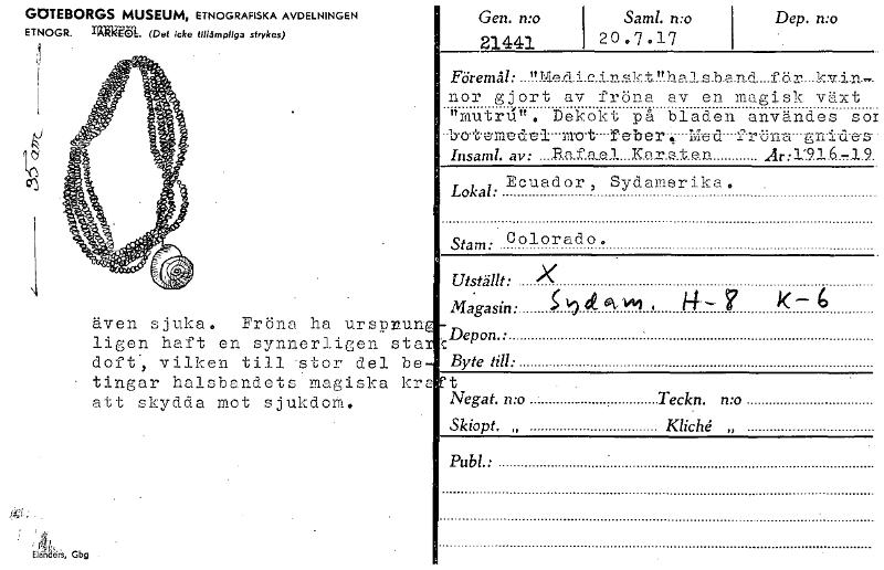 GOTEBORGS MUSEUM, ETNOGRAFISKA AVDELNINGEN ETNOGR. IRL. (Det icke tillämpliga sfrykes) även sjuka. Fröna ha urspvung ligen haft en synnerligen star doft, vilken till -stor del be - tingar halsbandets magiska kro att skydda mot sjukdoM. ;:.4.;•1; Eldos. Gbg Gen. mo . 21441 Saml. mo 2 0 . 7.17 Dep. n:o Föremål: hand. ... fär_kvin- nor gjort av fröna av en magisk växt "mutrun. Dekokt på bladen användes sor Hyo-t-e-medel---mo-t-feber,. Med----2-rönm-gn-i-d-e-s ' Insaml. av: Rafel Kal'zten At-V9 1 6 -19 Ecuador , Sydamerika. Lokal: Stam: Colorado. Utställt: Magasin: kg ge 6VViii , H— 7 K — 6 cDepon.• Byte till: :it Negat. n:o Teckn. n:o Skiopt. „ Kliché ” Pub!.: [ocr]Stäng