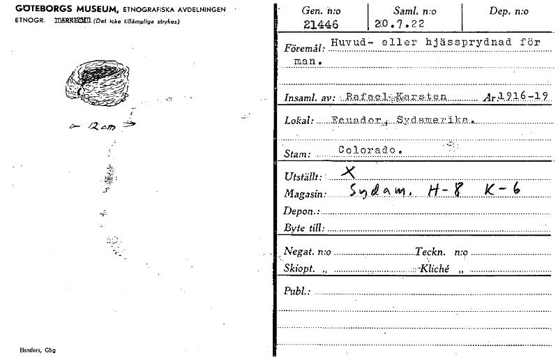 GOTEBORGS MUSEUM, ETNOGRAFISKA AVDELNINGEN ETNOGR. ITARKMCI (Det icke tillämpliga strykes) Elanders, Gbg Gen. n:o 21446 Saml. n:o ao . 7 . 22 Dep. n:o Föremål: Huvud- eller hjässprydnad för man. Insa...