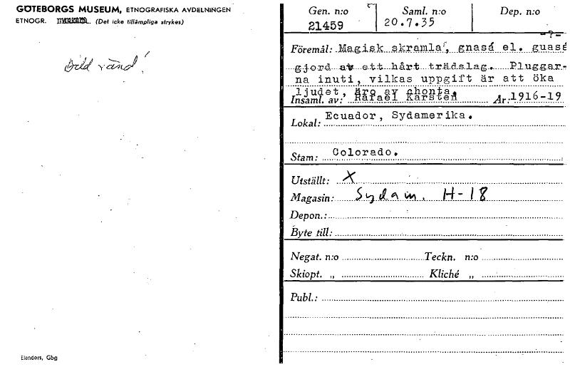 • GOTEBORGS MUSEUM, ETNOGRAFISKA AVDELNINGEN ETNOGR. MUM3L. (Det icke tillämpliga sfrykes) bz4/ Ya-4J Elanders, Gbg Gen. n:o 'r 21459 Saml. n:o i 20.7.35 Dep. n:o -..:›- Föremåh_Magisk skramlar, gnaså ... Visa hela