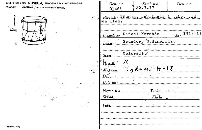 GOTEBORGS MUSEUM, ETNOGRAFISKA AVDELNINGEN ETNOGR. P (Det icke tillämpliga strykas) Elanders, Gbg Gen. mo 21461 Sam!. mo 20 .7.37 1 Dep. mo _&Tmg: Trumma, anbringas i taket vid F en lian.. Insaml. av: Ra f ae 1 Kastön År: 1916-15 , Lokal: Stam: Ecuador, Sydamerika . Colorad6i' ' Utställt: ' Magasin: • DePCM.• Byte till: 51.9 4-'s‘ wi - 1 g0 Negat. mo Skäm. „ • -,. Teckn.. n:o - .. . . Kliché „ . Publ.: [ocr]