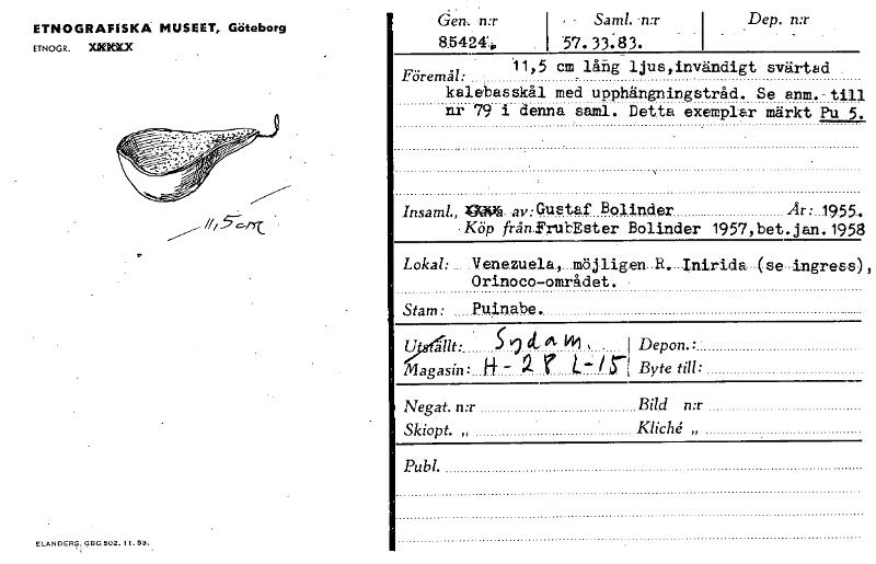 • ETNOGRAFISKA MUSEET, Göteborg ETNOG R. Xf■EWC if/5;4Tc' Gen. n:r I , - Sand. sn:r 1 Dep. n:r 8.5424... . I 5'7.33.83. . 11,5 cm låfig ljus,invändigt svärtad . Föremål: , kalebasskål med upphängningst... Visa hela