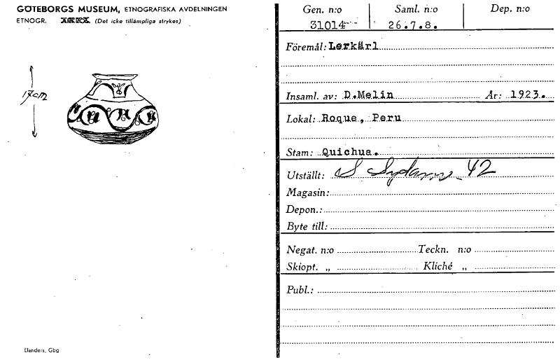 GOTEBORGS MUSEUM, ETNOGRAFISKA AVDELNINGEN ETNOGR. XKRICC,. (Det icke tillämpliga strykas) Elandels, Gbg Gen. n:o 31014-- I Saml. ri:o I 26.7.8. Dep. n:o Föremål:Le:titlar). Insaml. av: .D.. .......... År : _1.9.23,-- Lokal: ...11.o.q.u.e..,....P.e.r.u. Stam: ...Quichua.. / --7.94....-,...- V,2- Utställt: i.--, Magasin: Depon.: Byte till: Negat. n:o Teckn. n:o Skiopt. „ Kliché „ Publ.. [ocr]