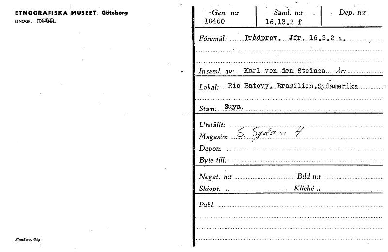 • -Gen. n:r - Saml. n:r 18460 16.13.2 f Dep. n:r ETNOGRAFISKA HMUSEET, Göteborg ETNOGR. MUR. Föremål: Trådprov. Jfr. 16.3.2. a. Insaml. av: Karl. von..den...Stelrien. Är: Lokal. Rio Batovy, Brasilien,... Visa hela