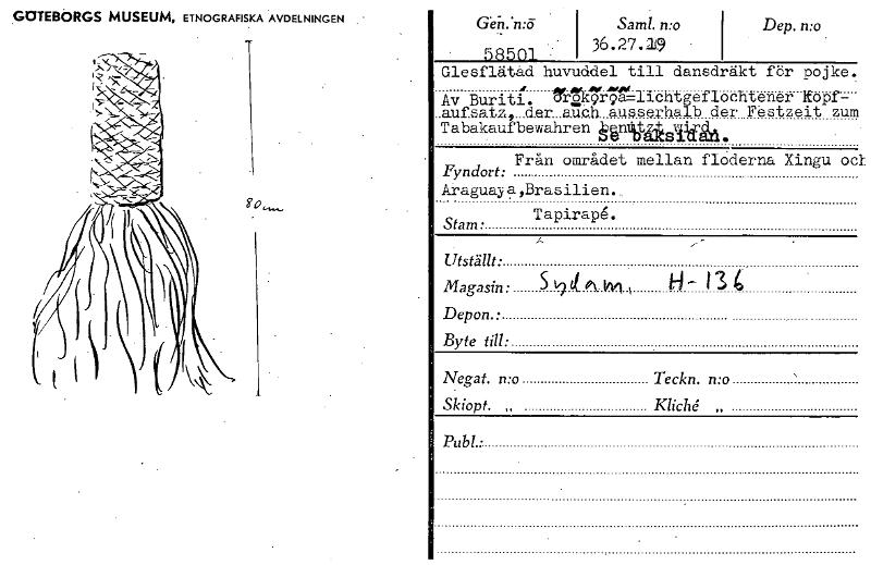 GOTEBORGS MUSEUM, ETNOGRAFISKA AVDELNINGEN 1-. aeri.'n:ö Samt. n:o 1.• 5R501 36.27.19 • • Dep. Glesflätad huvuddel till dansdräkt för pojke. Av Burit!. trök7r7t-lichtgeflochtener ltopf- .aufsa.tz,...d.er...auoh ausserhalb der Festzeit zum T abakauf bewahr en ågntititadicfcl. an. Från området mellan floderna Xingu oc Fyndort: Ara.guay a 'Brasilien.. Tapira-.pe. Stam • --- Utställt: Magasin: 5194( M141 h 1-1 — 13 Depon. • Byte till: Negat. n:o Teckn. n:o Skiopt. „ Kliché. „ Publ • • [ocr]Stäng