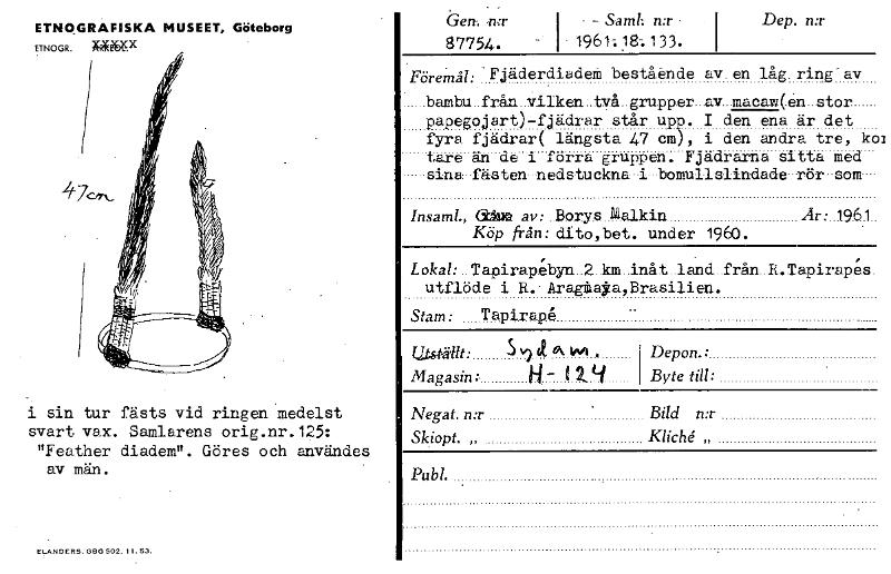 ETNO.GRAFISKA MUSEET, Göteborg ETNOGR. MiaX i sin tur fästs vid ringen medelst svart vax. Samlarens orig.nr.125: "Feather diadem". Göres och användes av män. ELANDERS, GBG 502. II. 53. Gem,mx I 87754. --Samt: nx- .1961;18;133. I Dep. nx Föremål,: -Fjäderdiadeä bestående av.en låg.ring-av bambu_från.viikanAyk.grupper...avmacaw(en stor papegojart)-fjädrar står upp. I den ena är det fyra fjädrar( längsta 47 cm), i den andra tre, kc tare ån ae i forra gruppen. Fjadrarna sitta med sina fästen-nedstuckna ' bomullsiindade-rör-som-- hisanil, alm av: Borys Mglkin Ar:..19.61.. Köp Nn:dito,bet. under 1960. , . LokaL..Tapirapebyn..2..km_inåt.land.från R.Tapirape.s. utflöde i R..kragiajta,Brasilien. Stam : ..... TRpirop6 - Ct&tidlt: 5 v) lit ek IM , Depon.: Magasin:- H - 1 2.9 Byte till: , Negat. n:r Bild nx Skiopt. v KlkU. . Publ. [ocr]