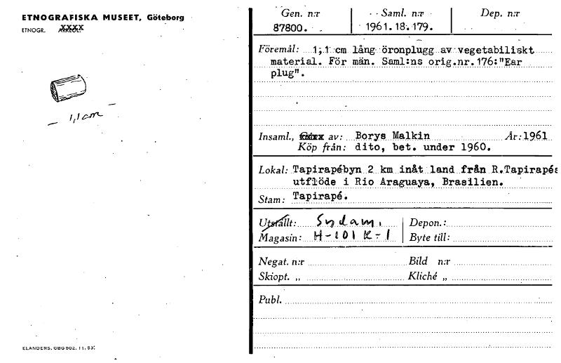 ETNOGRAFISKA MUSEET, Göteborg ErNocR. AlkiW Gen. n:r I - Saml. n:r Dep. n:r 87800. _ I 1961.18-.179. Föremål: 1-,1 -cm lång öronplugg av-vegetabiliskt material. För män. Saml:ns orig.nr.176:"Ear plug". Insaml., Et= av: Borys Malkin Ar:1961 EW från: dito, bet. under 1960. Lokah Tapirapebyn 2 km inåt land från R.TapirapeE utflöde i Rio Araguaya, Brasilien. irape Stam: TaP allt: it (A., i Magasin: H—aol te Depon.: Byte till: Negat. n:r Bild n:r Skiopt. „ „ Publ. ELANDERS. GE1G 502. 11. 53: [ocr]Stäng