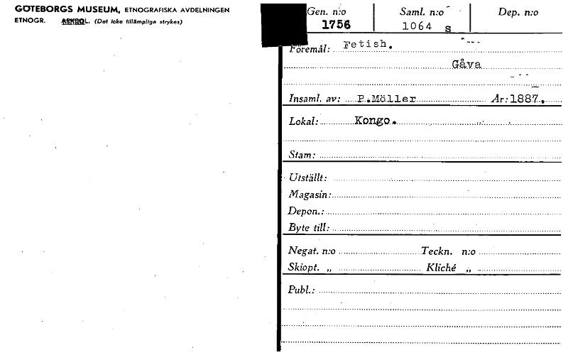 • GOTEBORGS MUSEUM, ETNOGRAFISKA AVDELNINGEN ETNOGR. .ffigligh. (Det Icke tillämpliga strykes) Gåva Insaml. av: P./M.11ex År:188.7., Lokal: Kongo. ..• Stam: Utställt: Magasin • Depon.: Byte till: Nega... Visa hela